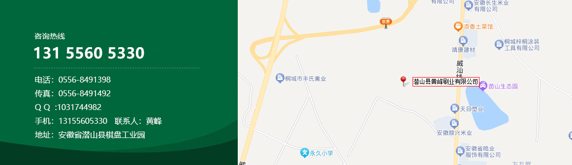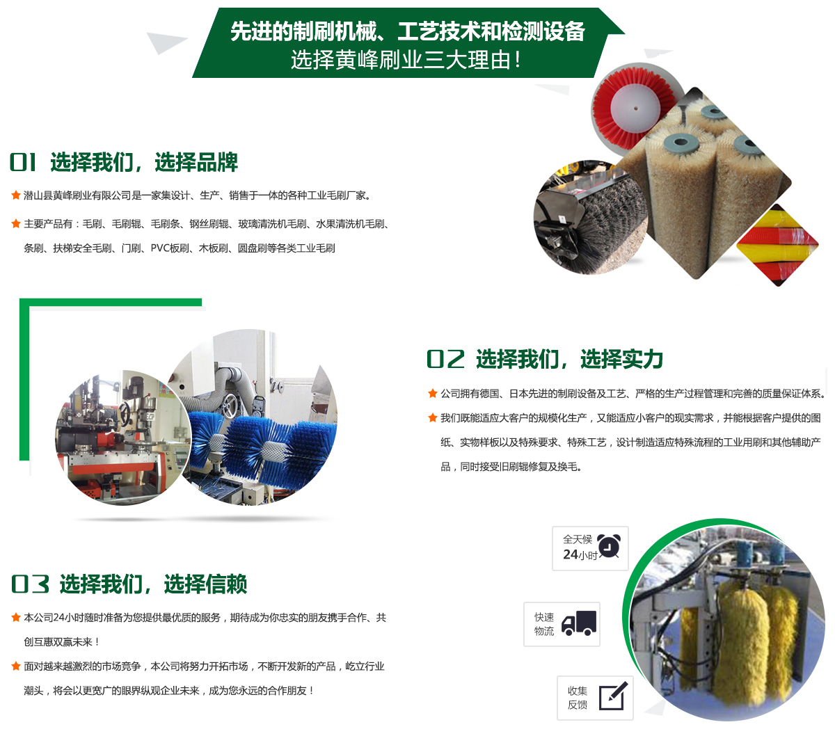 - 潛山縣黃峰刷業有限公司座落在國家級旅游圣地,風景秀麗的天柱山腳下,南臨318國道,緊靠滬蓉高速公路,交通十分便利。 產品適用於金屬、薄板、卷板深加工行業,儀表深加工機械、制藥機械、紡織印染機械、玻璃深加工機械、建材行業、木業、皮革制鞋業、空調清洗業、陶瓷業、機床業、家俬業、表業、拋光業、水果清洗業、印刷業、電子工業、掃路車用刷等。同時可按客戶所提供的圖紙、實特樣板定制,解決了進口的設備國產化的難題,提供良好的諮詢服務,且品質可靠,同時還為客戶提供...